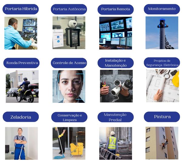 Oferecemos uma ampla gama de serviços, incluindo: Portaria híbrida; Portaria autônoma; Controle de acesso; Segurança Eletrônica; Mão de obra terceirizada especializada; Pinturas condominiais; Serviços operacionais. Estamos comprometidos em garantir a transparência e a satisfação em cada projeto que executamos.